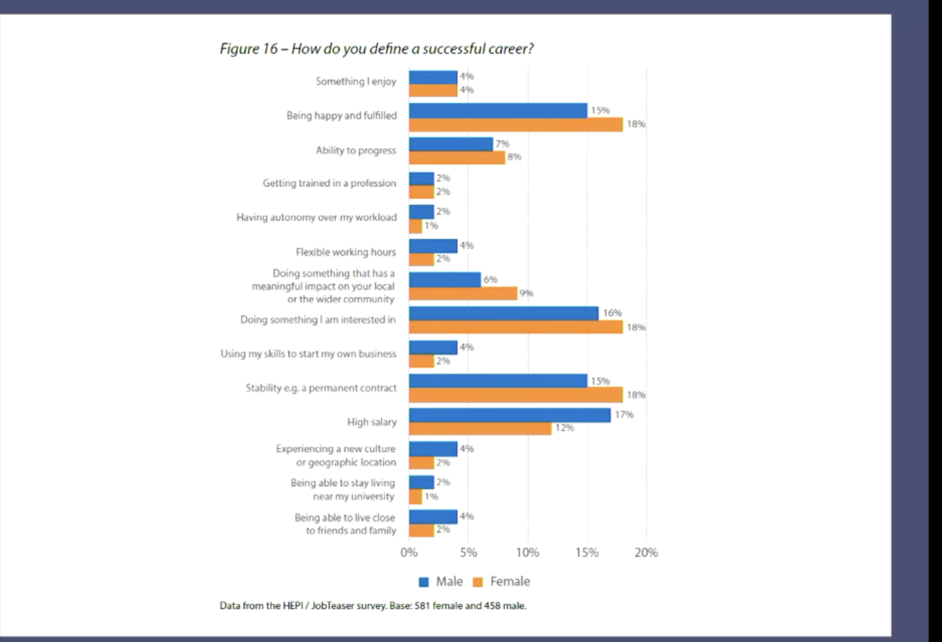 It shows that part of this gender pay gap could be explained about what men and women want in a career e.g. men want higher salary whereas being happy is more important for a women.