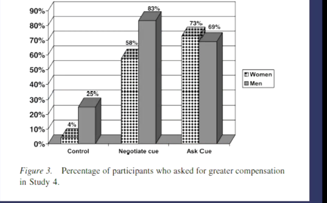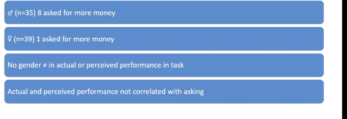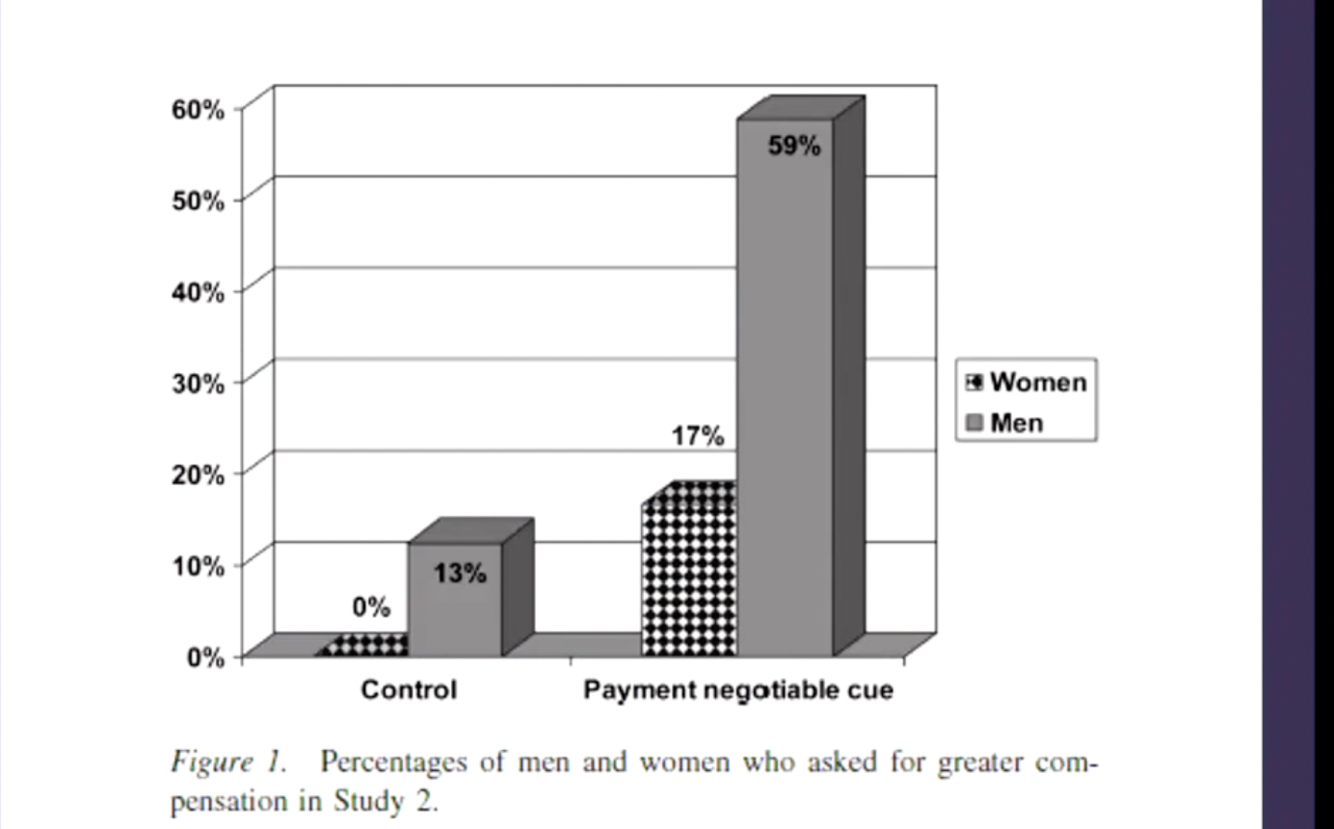This shows the gender difference in negotiation is not because women didn’t realise you could ask for more money, because in the treatment group everyone was told you could ask for more money but still didn’t.