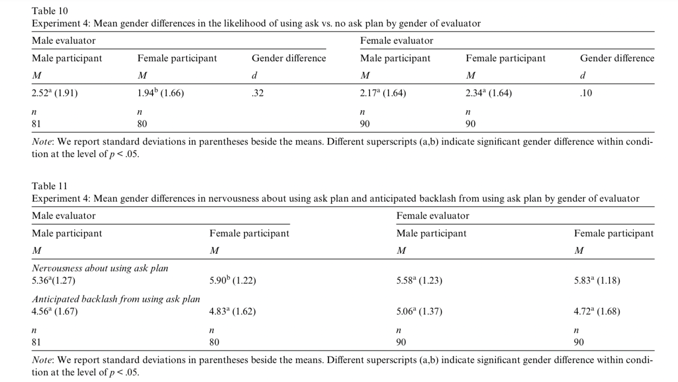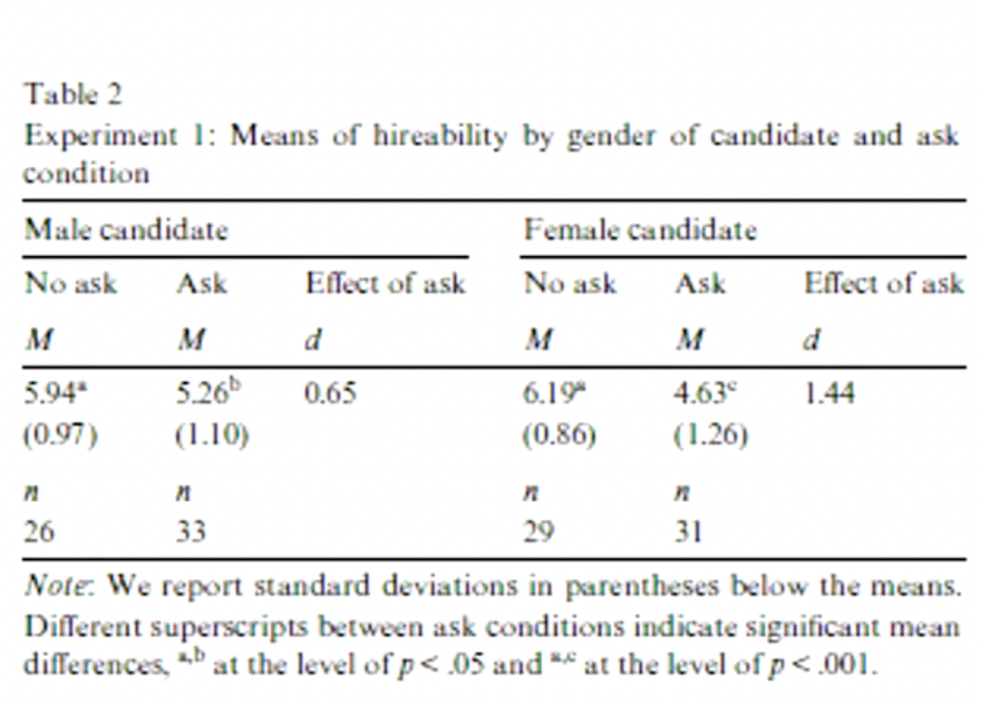 Due to the fact that results in experiment 1 may be a bit non reliable as the evaluators may were less inclined to hire a candidate who initiated negotiations , so the 2nd experiment deals with this, were the evaluator had some managerial experience and that the potential negotiator was that of job candidate who had already received an offer, so that negotiating would be seen as an acceptable practice. Then they read 4 transcripts - male/female and did they negotiate or not