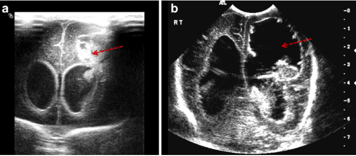 grade IV bleed (arrow in a), which developed into a porencephalic cyst (arrow in b).