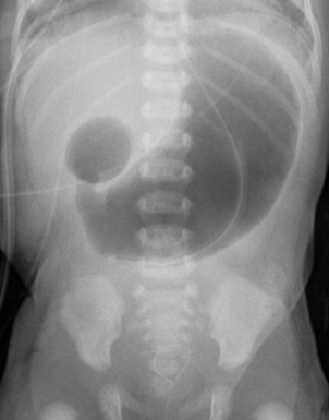 Abdominal x-ray showing double bubble sign, contrast studies may confirm the diagnosis
