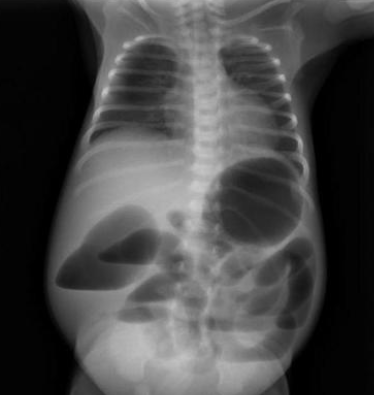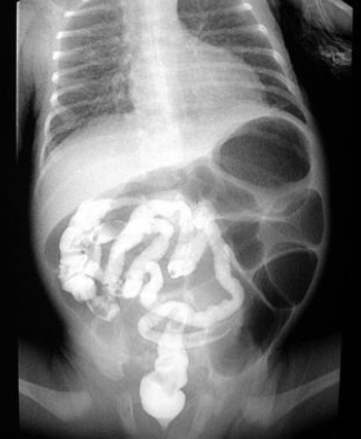 Usually 3-7 days after birth, volvulus with compromised circulation may result in peritoneal signs and haemodynamic instability