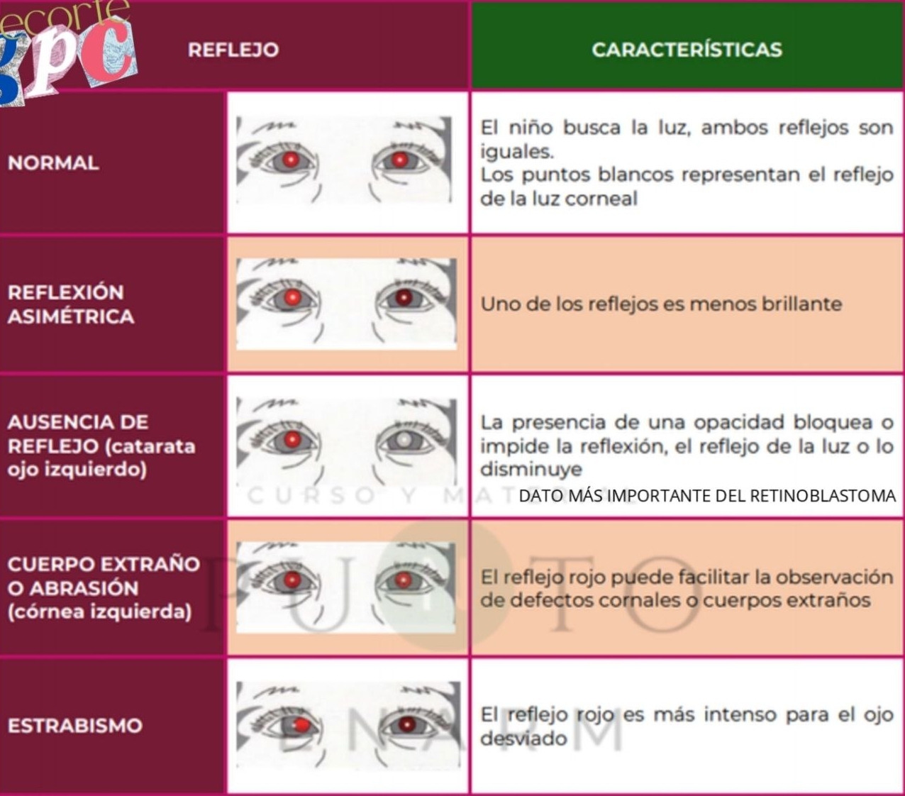 La ausencia o alteraciones del reflejo rojo puede ser sugestivo de catarata congénita, vítreo primario hiperplasico persistente anterior, retinopatia vitrea exudativa familiar, retinoblastoma, anisotropia grave y estrabismo