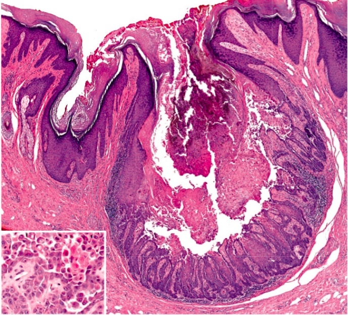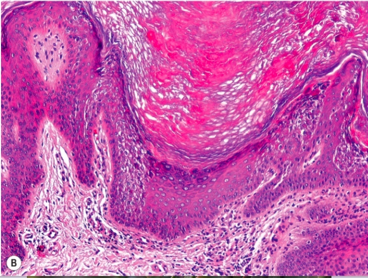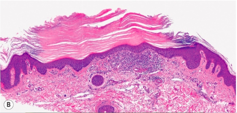 Path Finding: epidermal hyperplasia with prominent compact hyperkeratosis associated with granular and vacuolar degeneration of keratinocytes in the spinous and granular layers (epidermolytic hyperkeratosis).