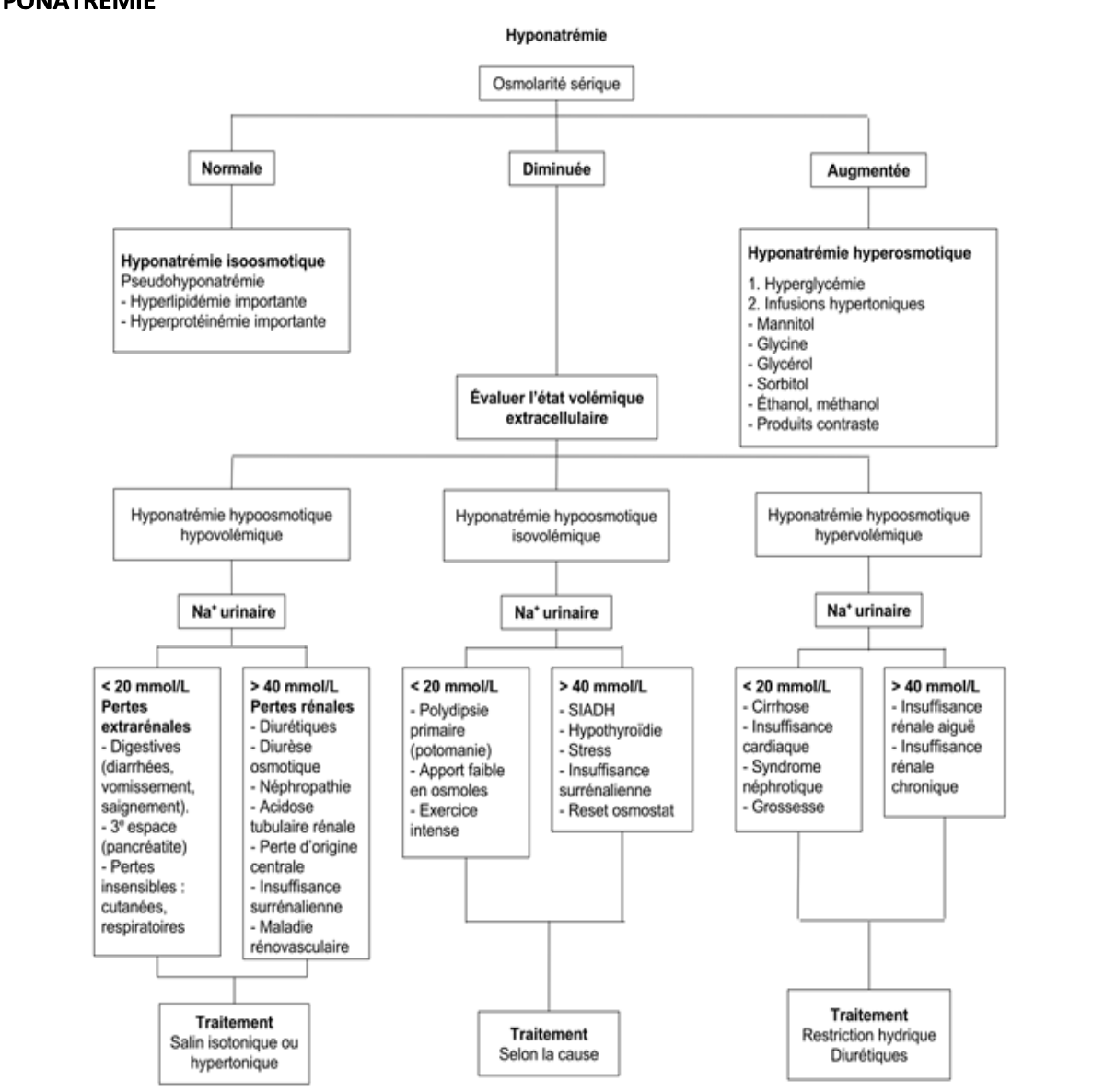 Principes : causes s-j, restriction hydrique, promouvoir la perte d’eau libre, monitoring du Na sérique, du volume et de la tonicité de l’urine, pas de correction rapide (on peut rajouter du sel PO pour le SIADH)