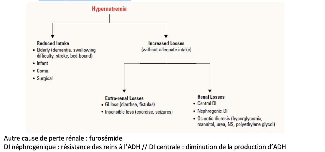 > 145 mmol/L (état hyperosmolaire TJRS); habituellement due à une perte d’eau nette, rarement à un gain de Na hypertonique (i.e. hypercorticosurrénalisme ou Na hypertonique IV)o Moins commun que l’hyponatrémie, car protection via soif et ADH