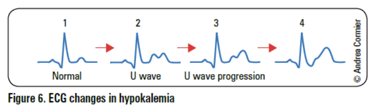 ▪ Dépression ST –disparition ou inversion de l’onde T – apparitiononde U – prolongation du QT – bradycardie sinusale – si sévère : prolongation PR, QRS élargi