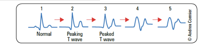 o Onde T raccourci et en pointe – diminution de l’amplitude et perte de l’onde P – prolongement de l’intervalle PR – QRS élargi et fusion avec onde T