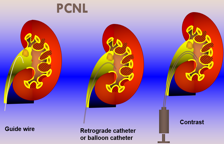 With a small 1 centimeter incision in the loin, the percutaneous nephrolithotomy (PCN) needle is passed into the pelvis of the kidney