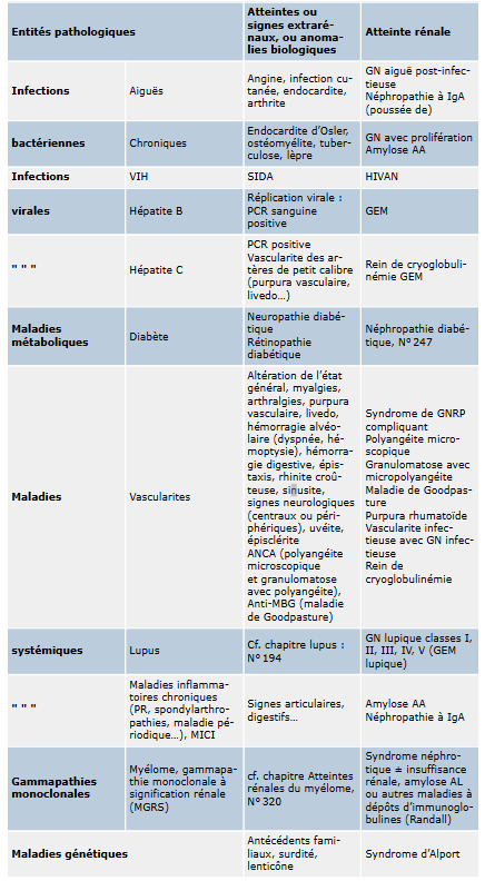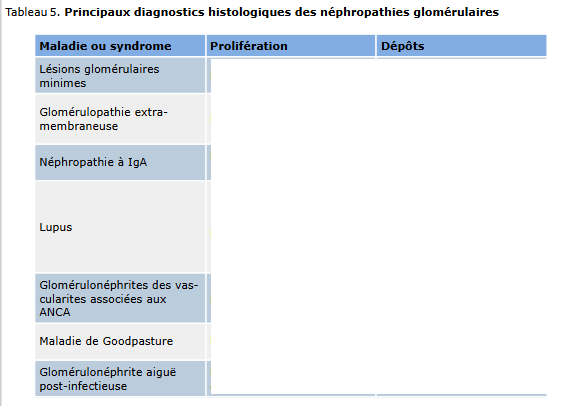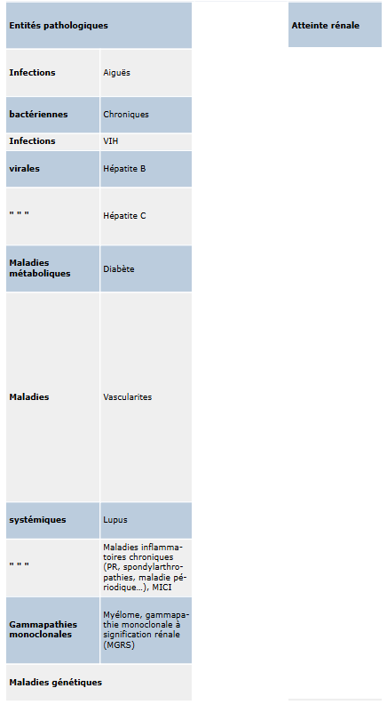 compléter le tableau suivant : il s’agit pour chaque entité responsable de néphropathie glomérulaire de dire quelle néphropathie glomérulaire ça donne