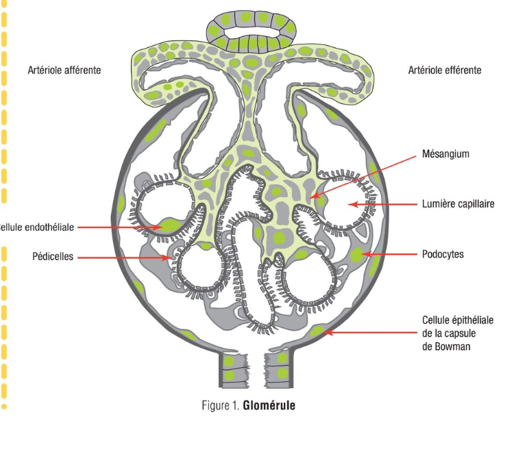 3- Les cellules mésangiales, présentes dans le mésangium qui est un tissu de soutien. Elles élaborent de nombreuses protéines de la matrice extracellulaire et sont capables de se contracter, modulant ainsi la surface de filtration glomérulaire