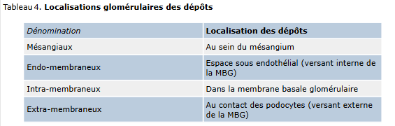 à propos des dépôts glomérulaires, donner la localisation glomérulaire des dépôts en fonction de la dénomination de ceux-ci
