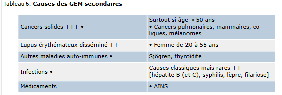 La GEM peut être primitive dans …% des cas ou secondaire dans …% des cas. Quelles sont les causes de GEM secondaires ?