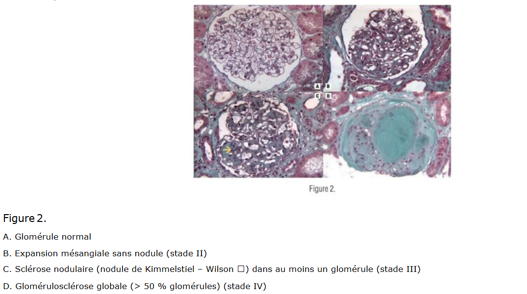 Dans le diabète de type 2 : idem sauf que l’HTA précède la néphropathie et les signes néphrologiques peuvent être présents à la découverte du diabète. Dans 25 % des cas, l’insuffisance rénale chronique n’est pas associée à une albuminurie.