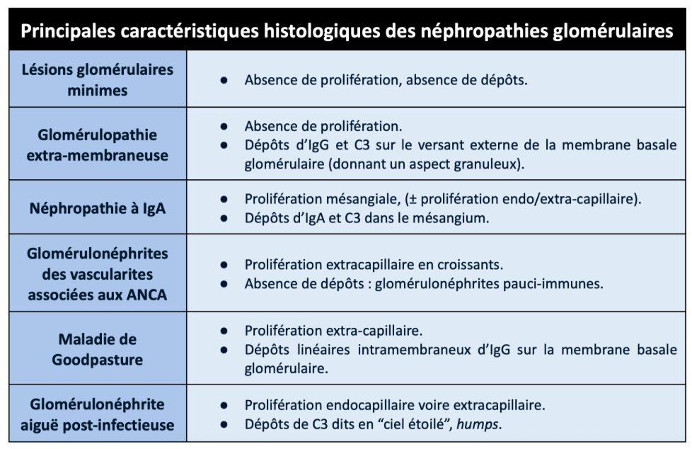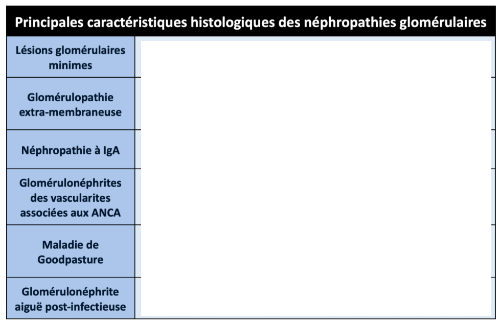 Compléter ce tableau sur les lésions des néphropathies glomérulaires