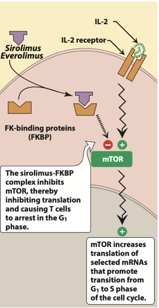 Binds FK receptor to inhibit mTOR (mammalian target of rapamycin) and arrest the T cell cycle to prevent proliferation (arrest of cell cycle at G1) -> which would normally be stimulated by IL2