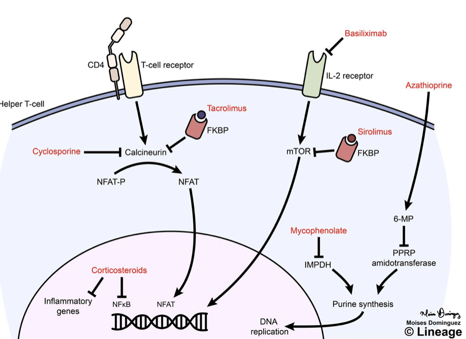 Calcineurin inhibitor; inhibit activation of NFAT (Nuclear Factor activated T cells) and reduce trascription of cytokines including IL2