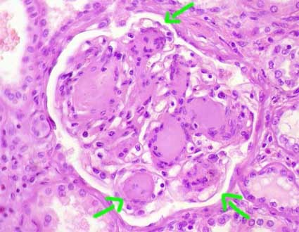 Kimmelstiel-Wilson lesion = seen w/diabetic nephropathy – BM thicking due to non-enzymatic glycosylation causing hypoperfusion and loss of albumin