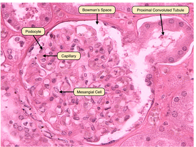 ball of capillaries (glomerulus) where blood flows and is filtered towards a double walled capsule (Bowman’s capsule)