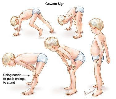 The child assumes the hands-and-knees position and then climbs to a stand by “walking” his hands progressively up his shins, knees, and thighs. This maneuver, known as Gowers’ sign, has been associated almost exclusively with Duchenne’s muscular dystrophy.