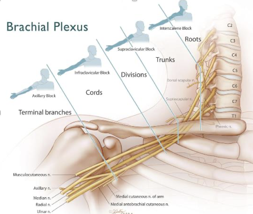 What area do you block when you put local anesthetic in the Axillary Nerve? What spinal root vertebrae is this associated with?