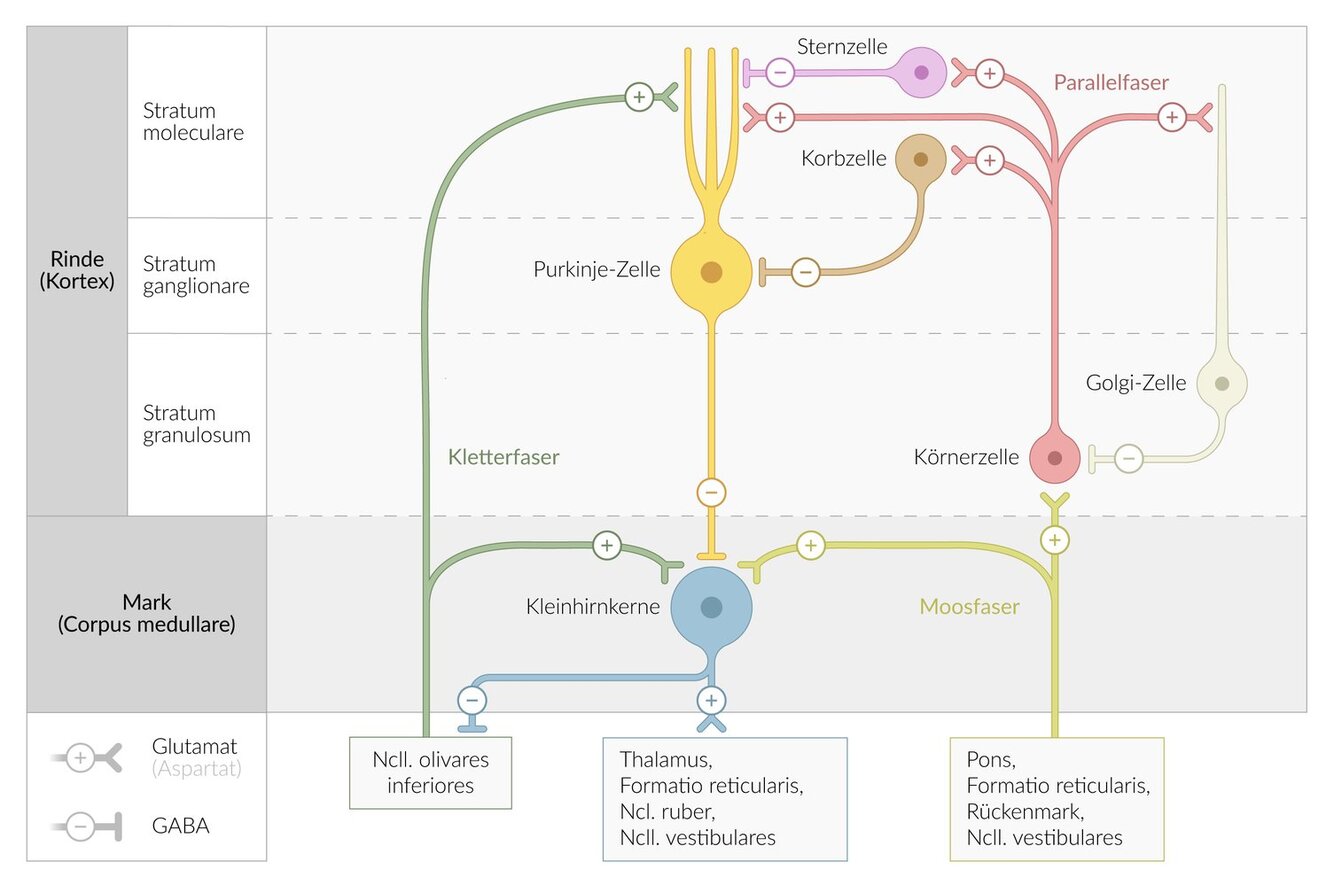 Die Körnerzellen erhalten von den Moosfasern ihre Afferenzen und erregen als Parallelfasern die Purkinje-Zellen sowie alle anderen Zellen der Kleinhirnrinde. Sie bilden die innerste Schicht der Kleinhirnrinde, das Stratum granulosum (Körnerschicht).