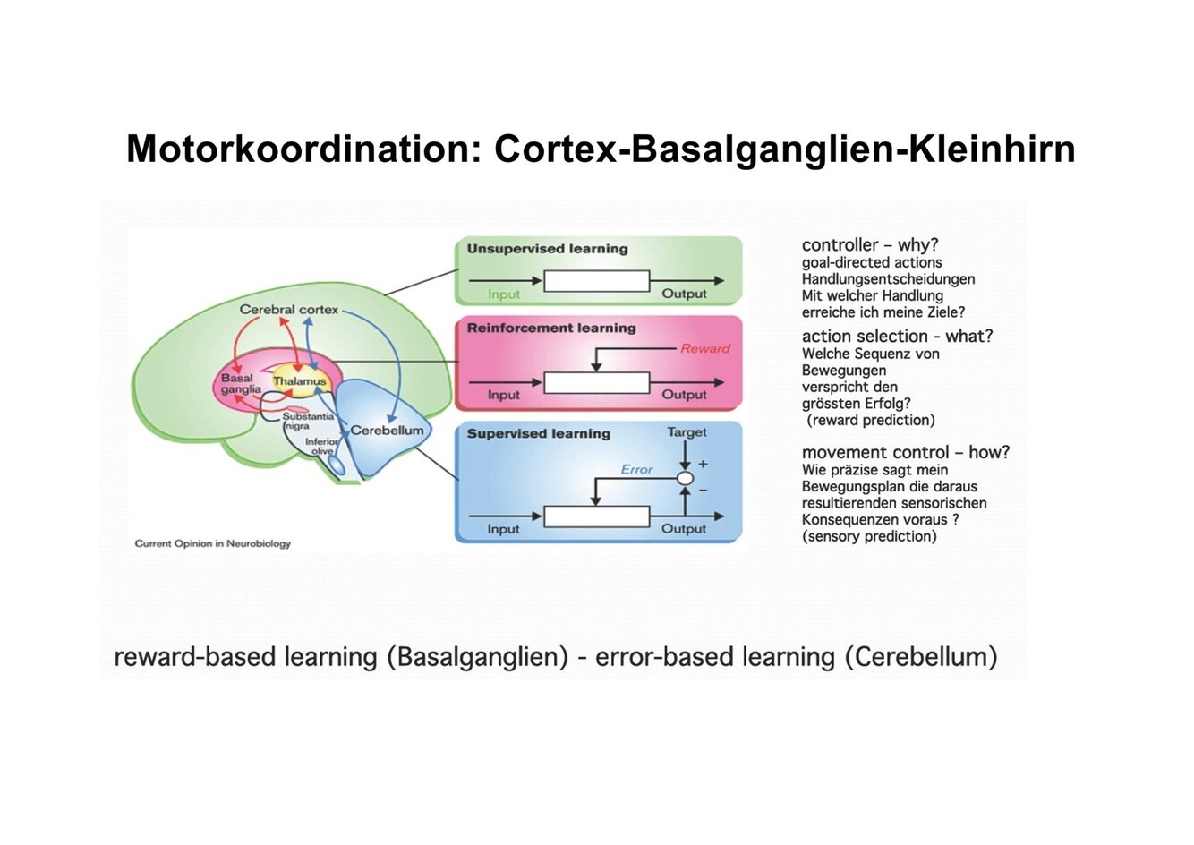 Cerebellum: Großer ‘Platz/Fläche’, wo der Plan, die ganze Komplexität einer Bwegung detailliert abbilden können, Fehlerbasiertes lernen, Fehler-Detetktion, Fehler-Korrektur, Optimierung/Reduktion von Fehlern