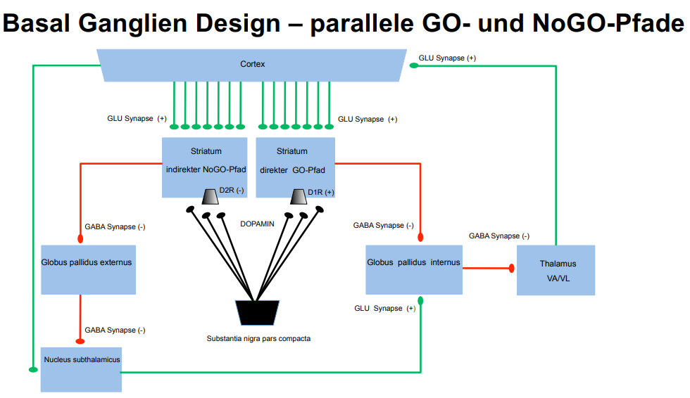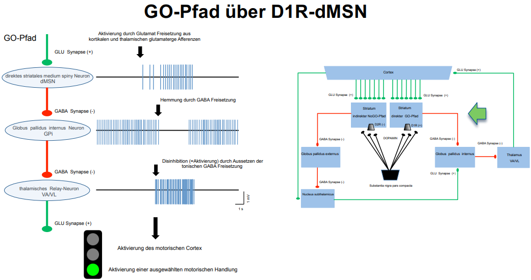 Es wird zunächst der Globus pallidus internus/medialis (GPi) (Transmitter: GABA) gehemmt.