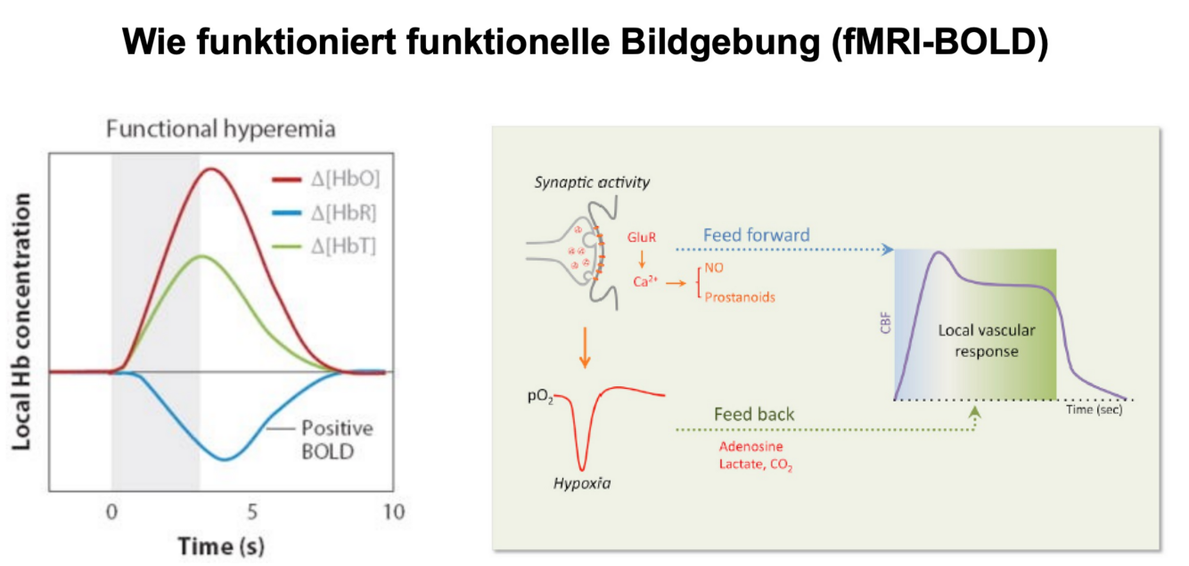 Dieser Effekt beruht darauf, dass oxygeniertes und desoxygeniertes Hämoglobin unterschiedliche magnetische Eigenschaften besitzen. Das fMRT hat eine gute räumliche Auflösung aber schlechte zeitliche Auflösung.