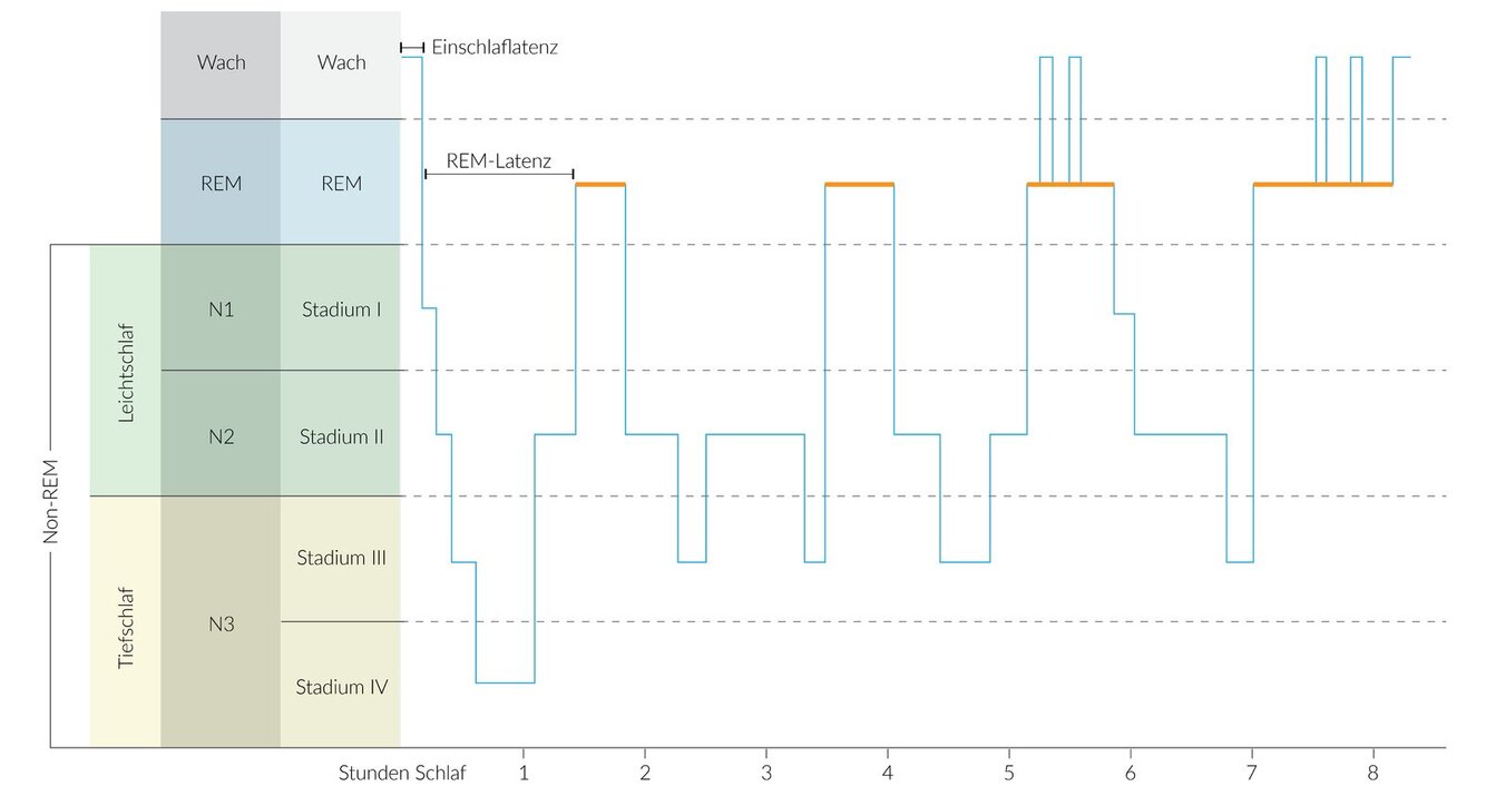 - Die Dauer und damit der Anteil der REM-Schlafphasen nimmt im Verlauf der Nacht zu