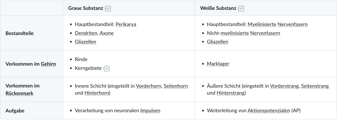 Die ____________ setzt sich größtenteils aus Nervenzellkörpern zusammen und ist in der Großhirnrinde bzw. im schmetterlingsförmigen inneren Anteil des Rückenmarks zu finden. Die ______________ hingegen erhält ihre Farbe hauptsächlich von markhaltigen Nervenfasern: Sie bildet im Gehirn das innen gelegene und im Rückenmark das außen gelegene Gewebe.