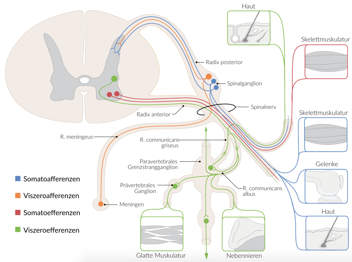 Im Bereich der Hinterwurzeln liegen die Spinalganglien, die die Zellkörper der afferenten Neurone enthalten