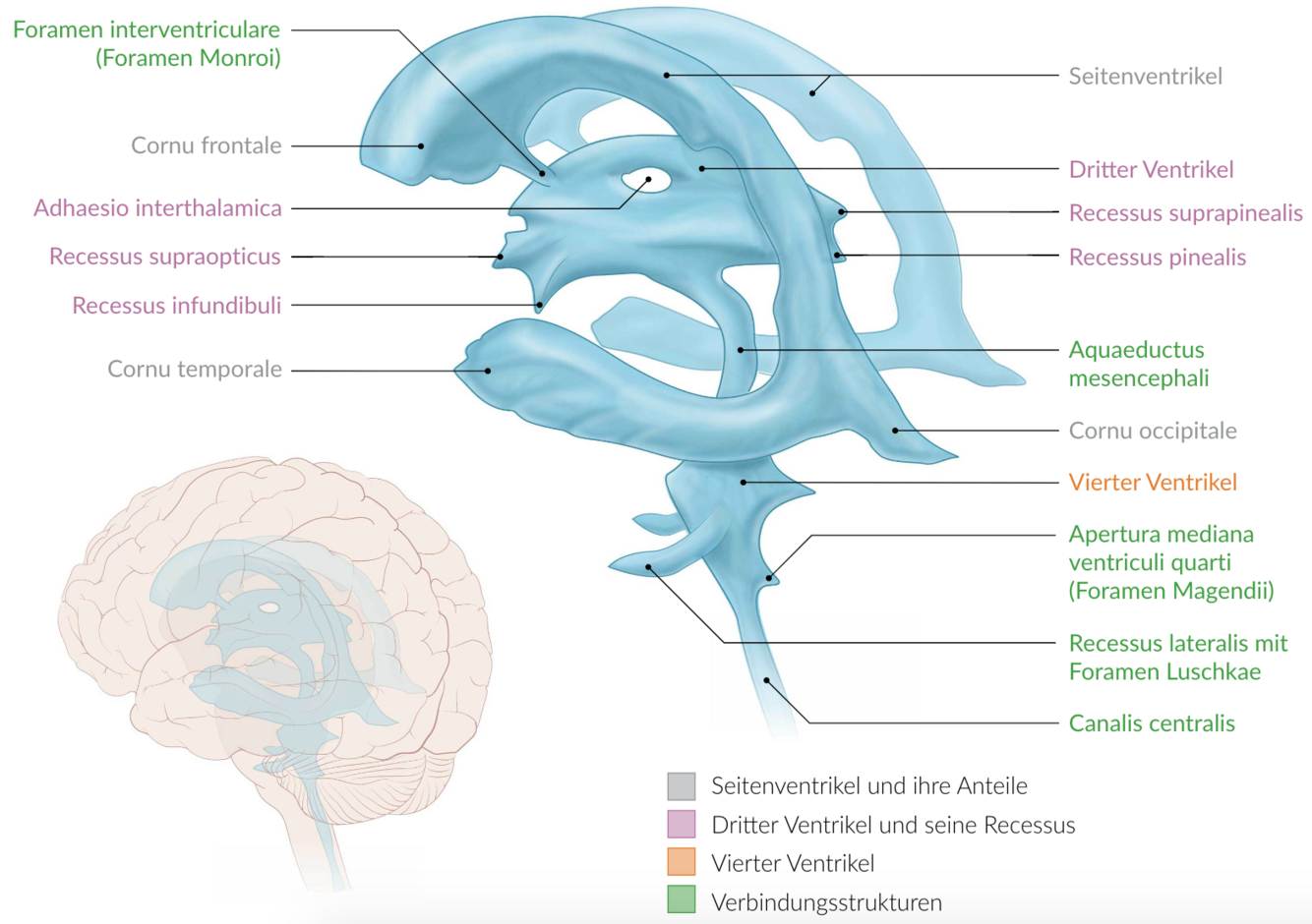 Im Vorderhorn und Hinterhorn der Seitenventrikel und im Aqueductus cerebri (mesencephali) gibt es keine Plexus chorioidei!