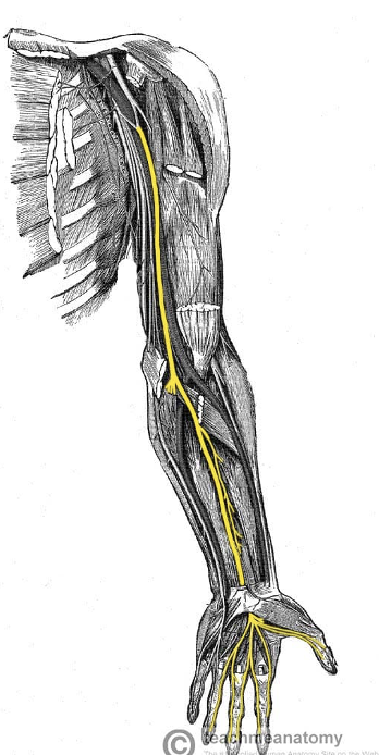 Motor Functions: innervates the flexor and pronator muscles in the anterior compartment of the forearm (except the flexor carpi ulnaris and part of the flexor digitorum profundus, innervated by theulnar nerve). It also supplies innervation to the thenar muscles and lateral two lumbrical in hand.