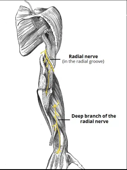 Sensory– Innervates most of the skin of the posterior forearm, the lateral aspect of the dorsum of the hand, and the dorsal surface of the lateral three and a half digits.