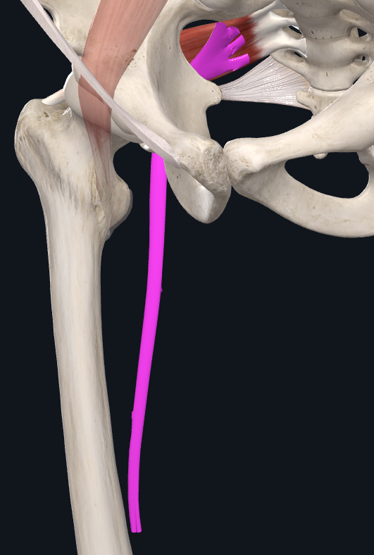 It emerges either inferior or through the piriformis muscle and descends in an inferoposterior direction.