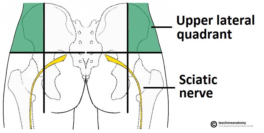 Intramuscular injections are only given to the upper quadrant of the gluteal region to avoid damaging the nerve.