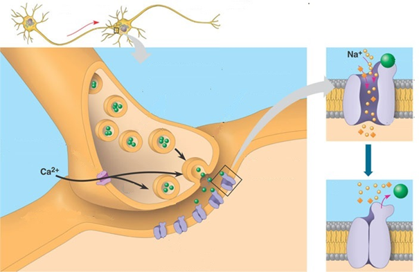 Når impulsen ankommer til at aksonets endeknop åbnes calicium-kanaler og calcium strømmer ind i cellen. Dette for vesikler med neurotransmittere til at bevæge sig mod indersiden af endeknoppens cellemembran. Ved exocytose frigives neurotransmitterne til synapsespalten. Neurotransmitterne vil derefter difunderer mod den postsynaptiske celles dendritter. Her vil neurotransmitterne sætte sig på receptorer, der findes i den postsynaptidke celles cellemembran. Dette får stimuliafhængige natrium-kanaler til at åbne sig, hvorved natrium kan strømme ind i cellen. Når nok kanaler er åbnes (og tæskelværdien overskrides) dannes der et aktionspotentiale og en ny impuls starter i den postsynaptiske celle.