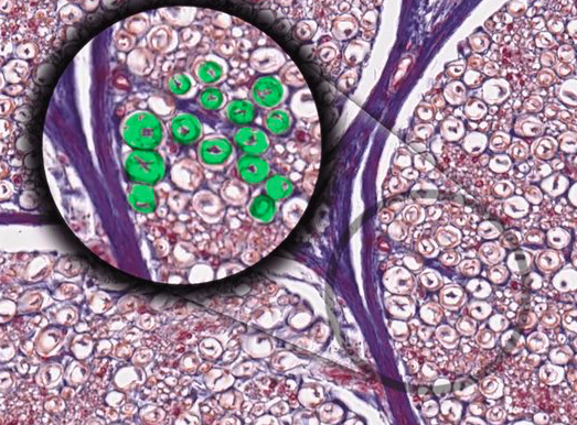 Se ven como gránulos, lo que se tiñe son los ribosomas