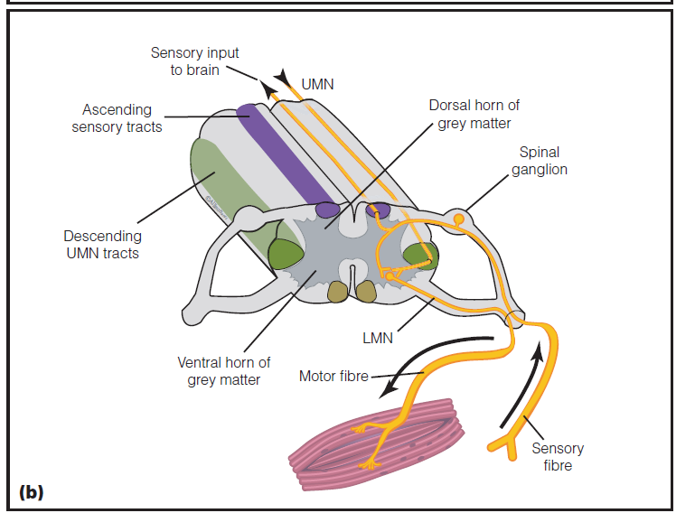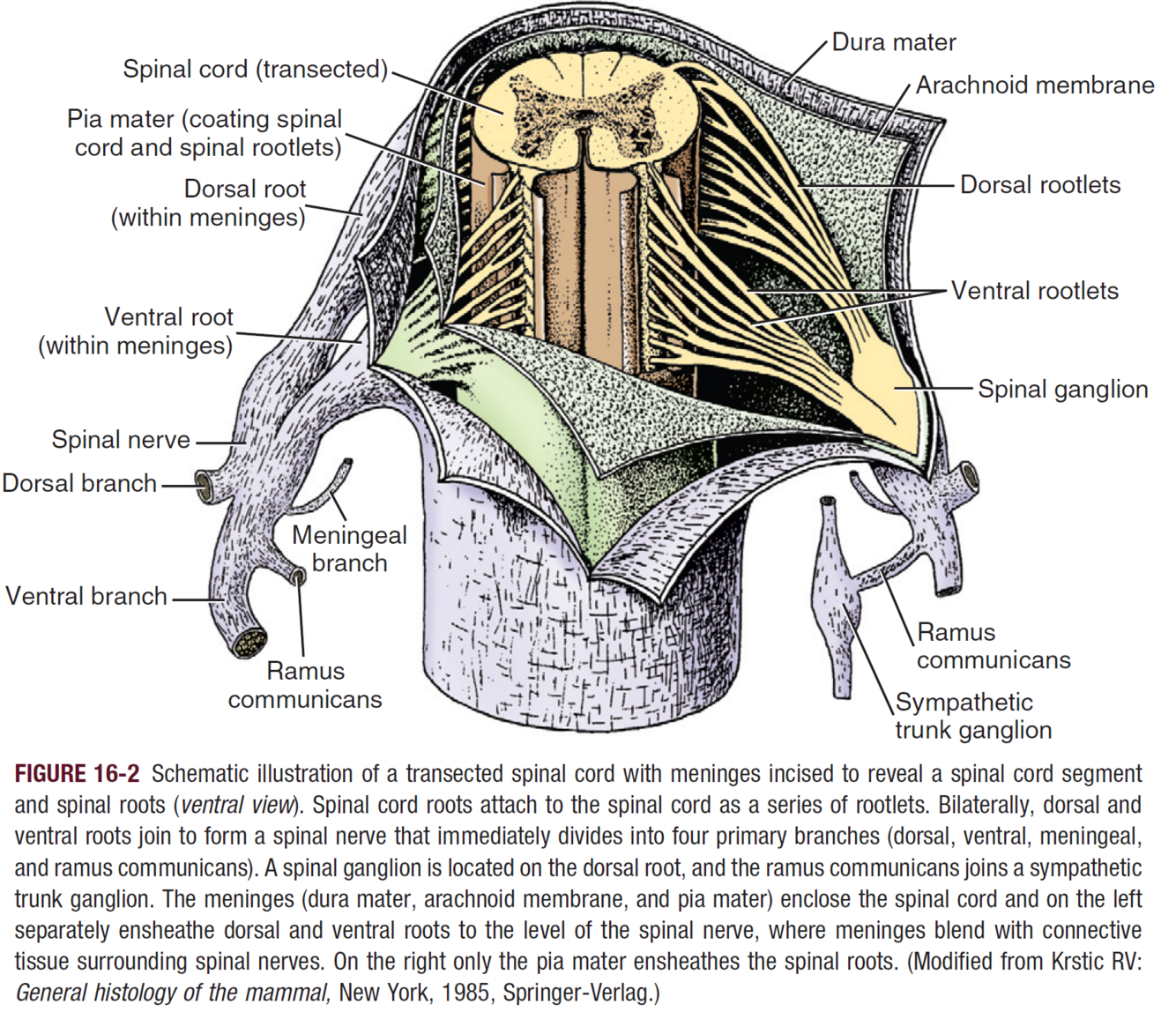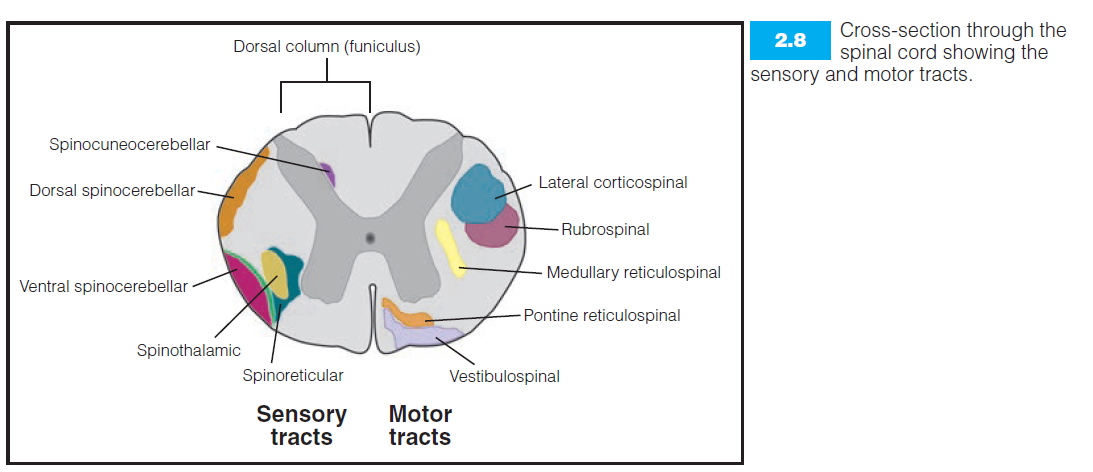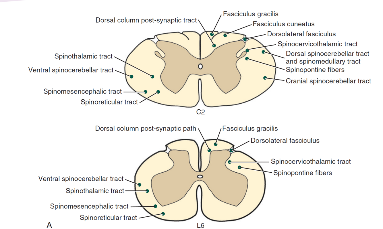 ventral roots, and axons that compose pathways that convey information cranially and caudally in the spinal cord. Cranially and caudally projecting axons conveying information from one location to another typically have a common function and travel together in the white matter. Collectively,