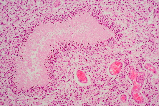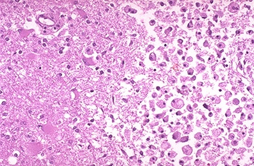 Glioblastoma - pseudo pallisading cells, cystic degeneration, anaplastic, necrosis