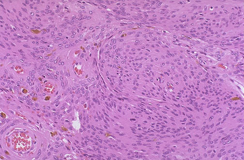 fried egg, calcifications, anastomosing capillaries, no mitotic activity, well circumscribed