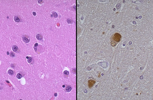 At the left, an H&E stain shows a rounded pink cytoplasmic Lewy body in a neuron of the cerebral cortex from a patient with diffuse Lewy body disease, which can be a cause for dementia. Lewy bodies can also be seen in substantia nigra with Parkinson disease. An immunohistochemical stain for ubiquitin, seen at the right, helps demonstrate the Lewy bodies more readily by the collection of intense brown reaction product within them.