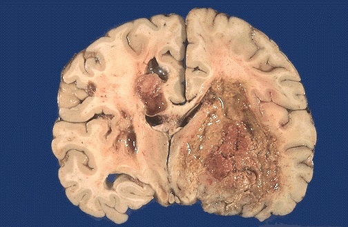 Glioblastoma gross - hemorrhage, firm white / soft yellow