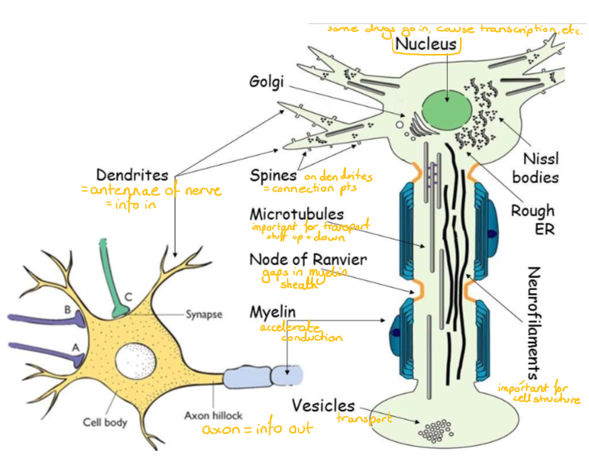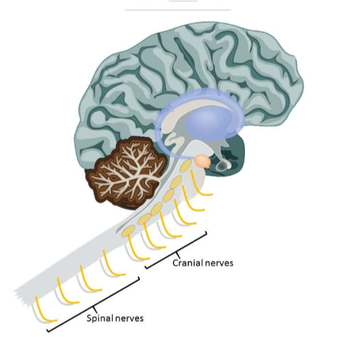 nerves in/out bottom of brain (not many) + nerves in/out spine