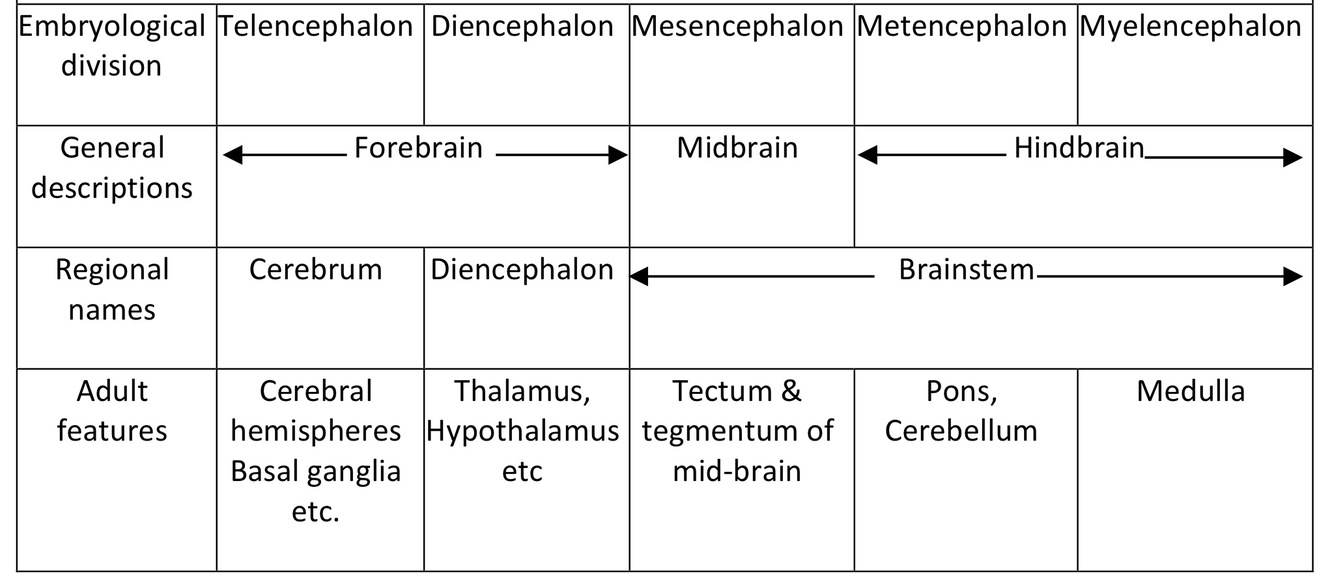 Name the primary and secondary vesicles of the brain and their adult derivatives