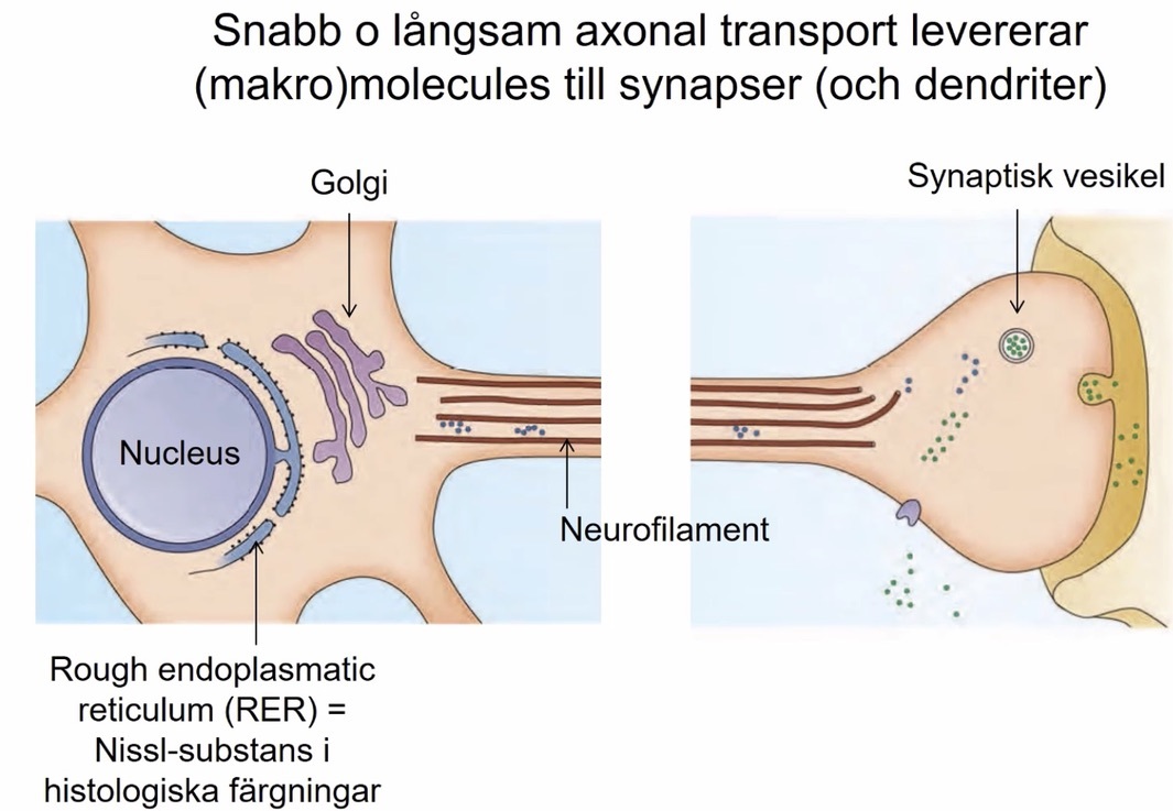 Förser synapser, axon och dendriter med bl.a. makromolekyler och organeller
