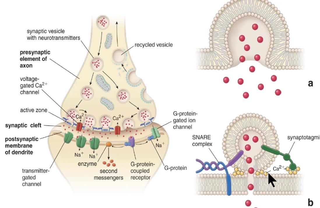Postsynaps med receptorer där RecA släpper in joner och RecB släpper in G-protein aktivering