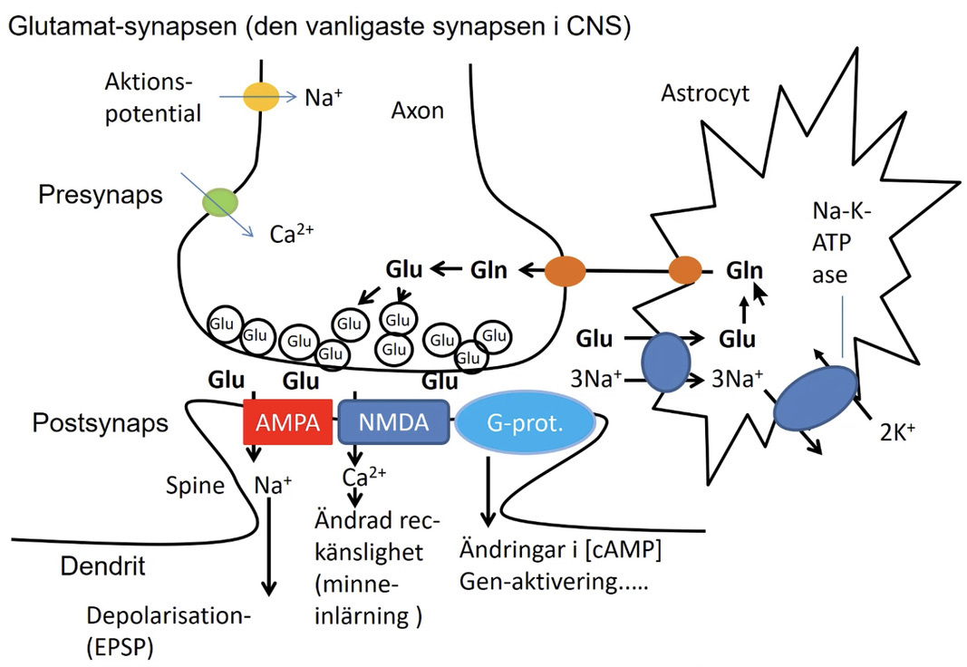Vad sker vid glutamat synapsen och vad har astrocyten för roll?