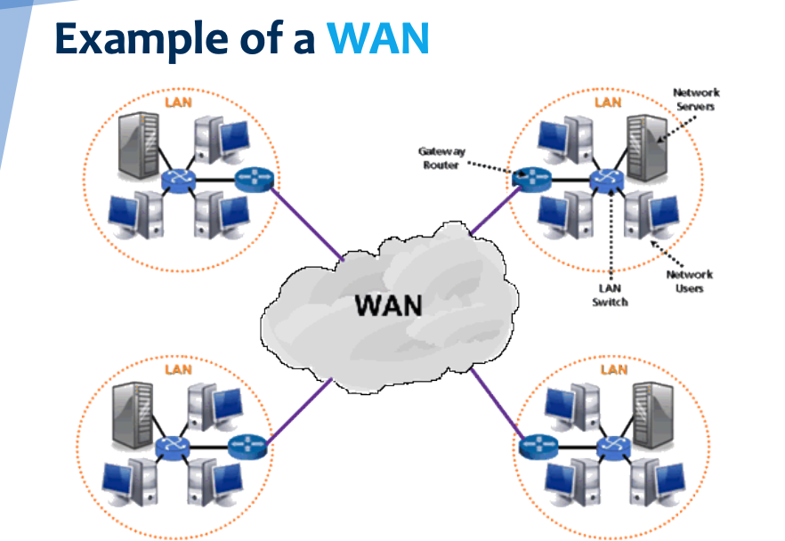 A network that spans many computers in widely separate locations, e.g. separate cities for example, linking bank offices and ATMs. WANS usually include connections that are public, e.g. not owned by the company.